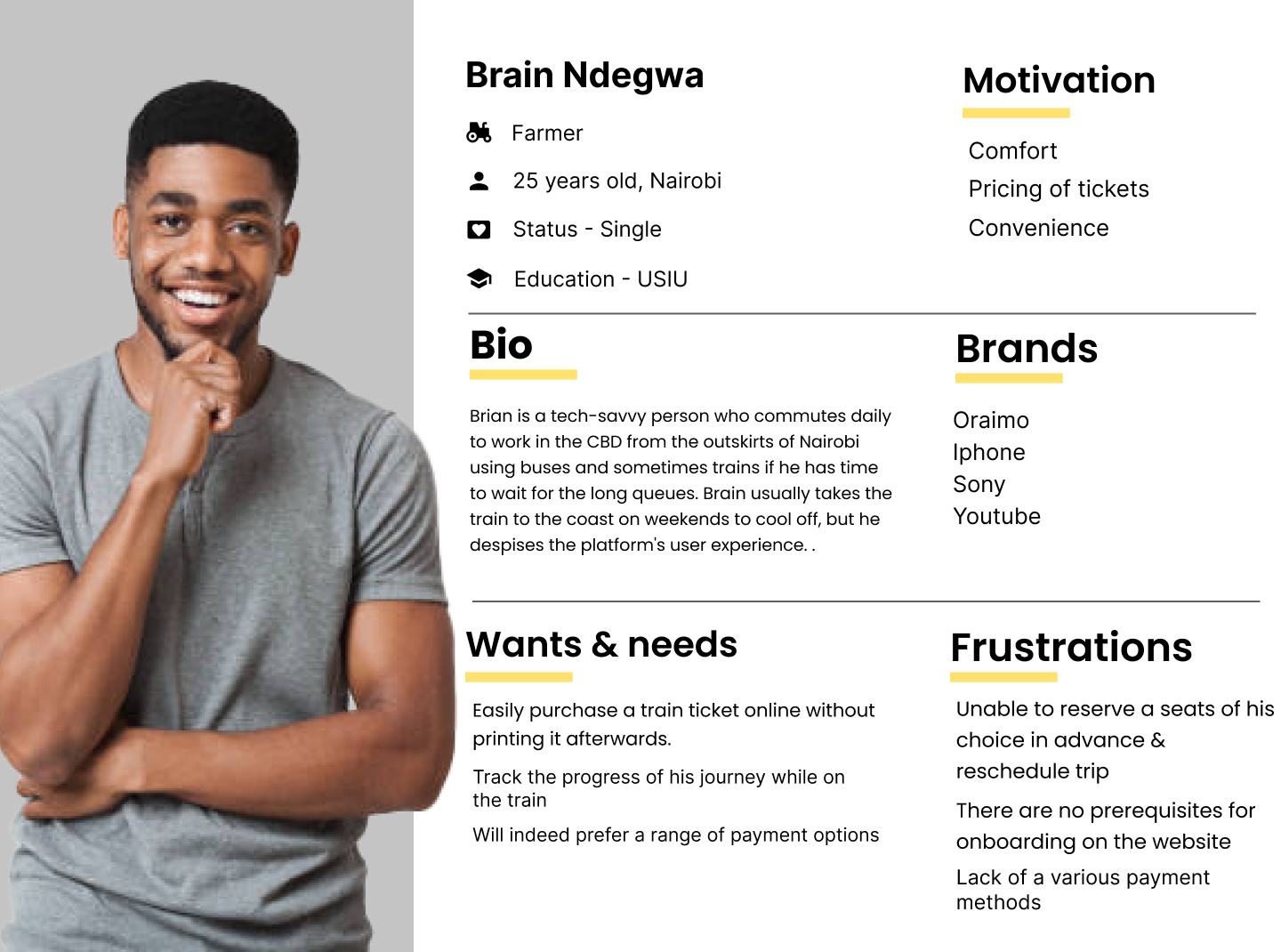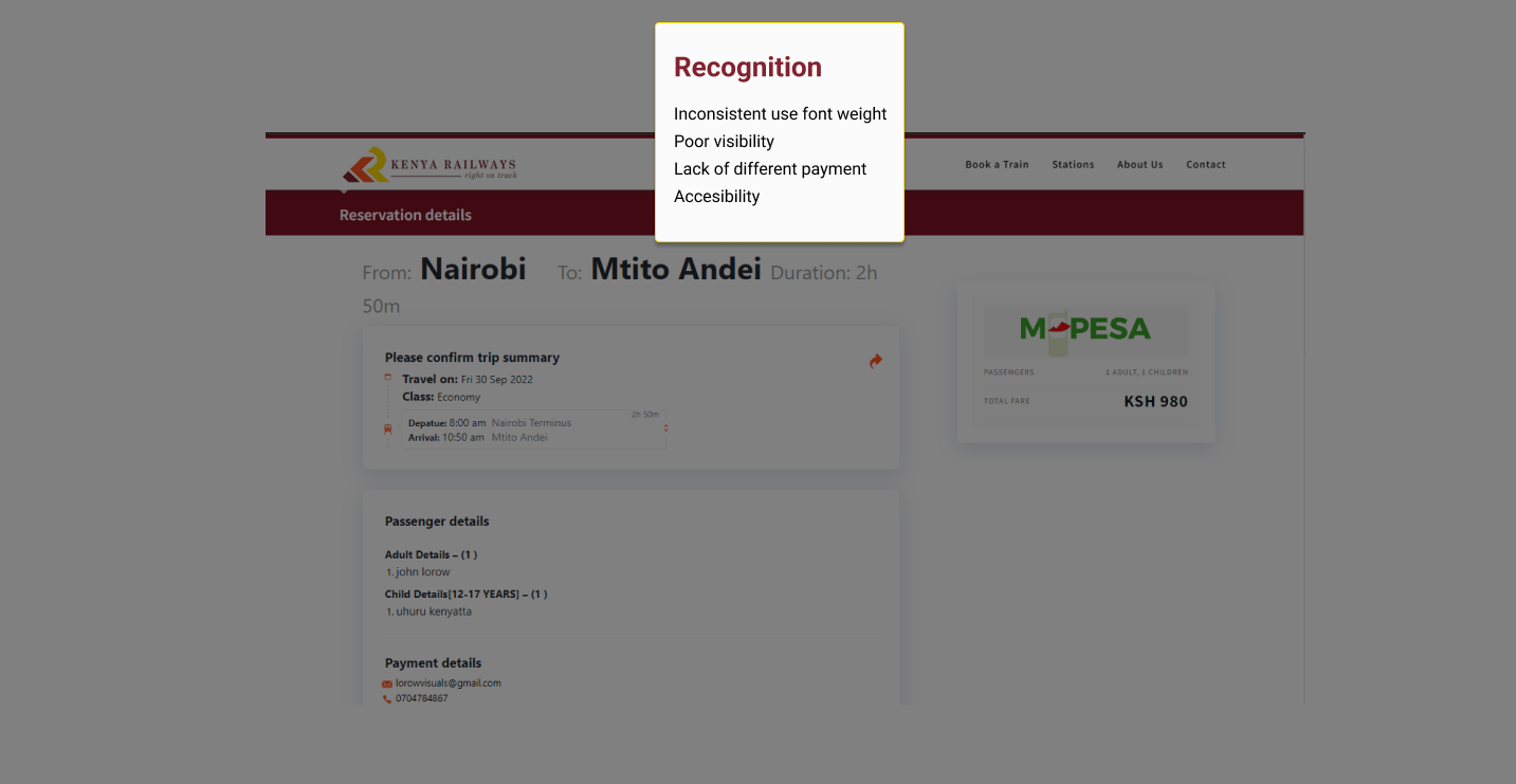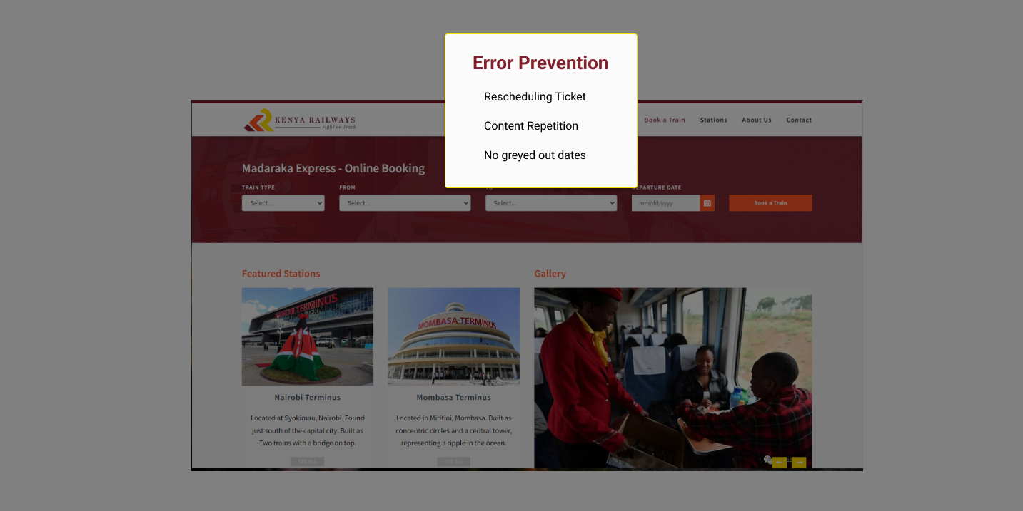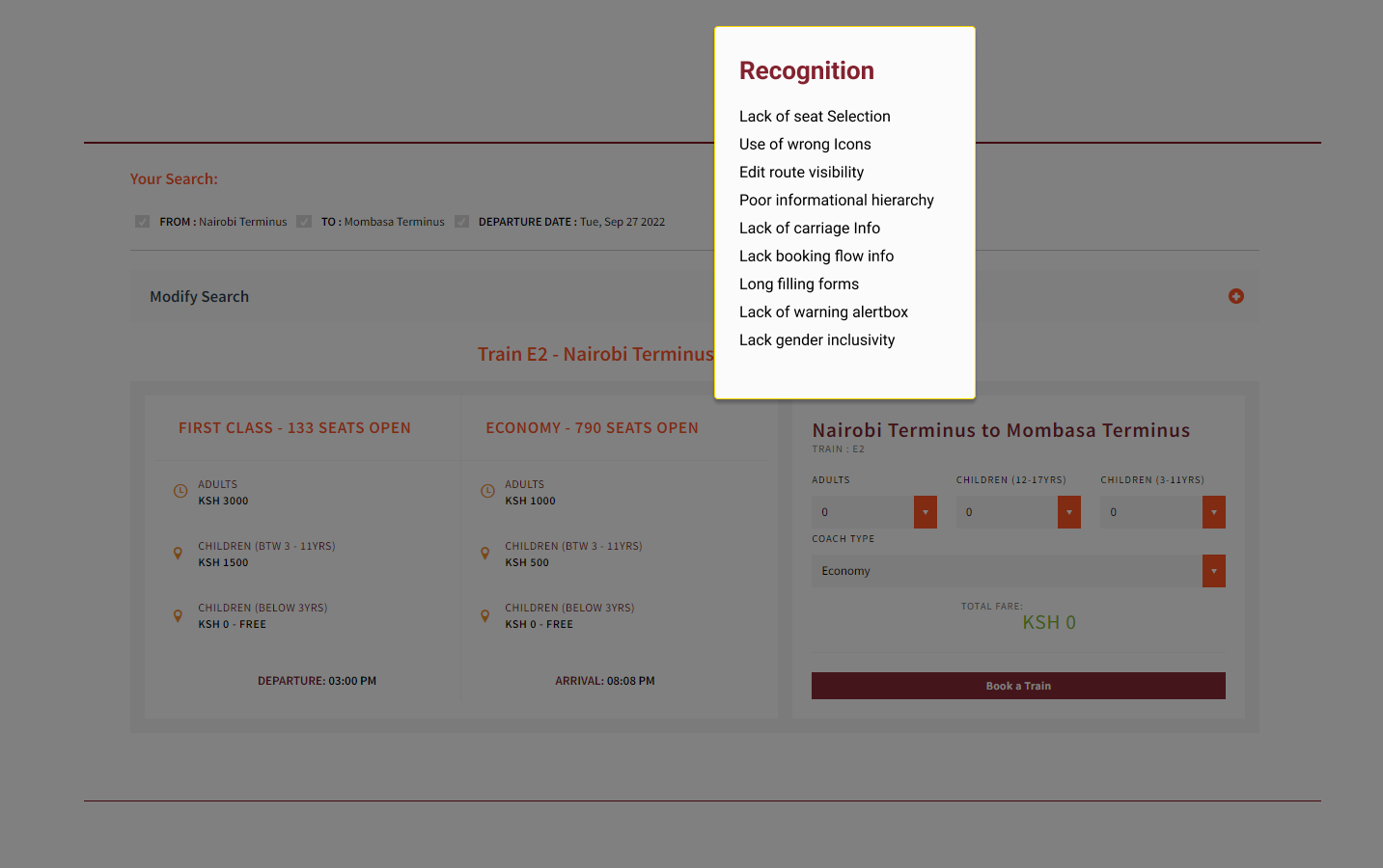 Rail transport in Kenya consists of a metre-gauge network and a new standard-gauge railway (SGR). Both railways connect Kenya's main port city of Mombasa to the interior, running through the national capital of Nairobi. The commission created a platform where travelers could book their tickets online which over a period of time has had its own share of shortcomings making the booking experience unpleasant to users. The purpose of this project redesign is to address the issues customers encounter when purchasing train tickets.