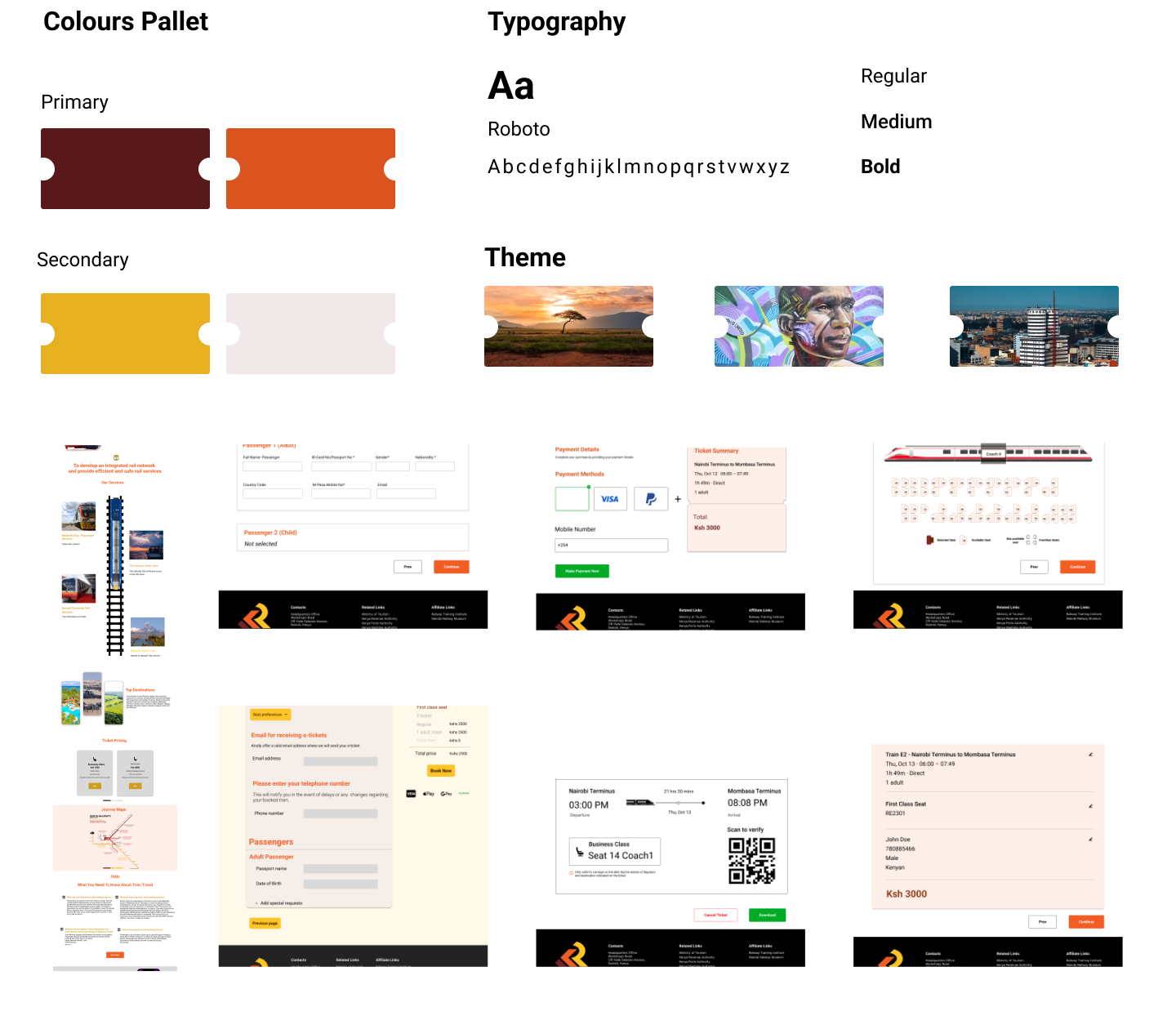 Before converting our low fi into high fi we develop a style guide design system we used the kenya railways logo brandng colours as our primary and secondary colours for visual consistency and brand identification . KRC brand is refined and expressive, with an attention to visual and motion details that create an experience that feels tailor-made to the user.